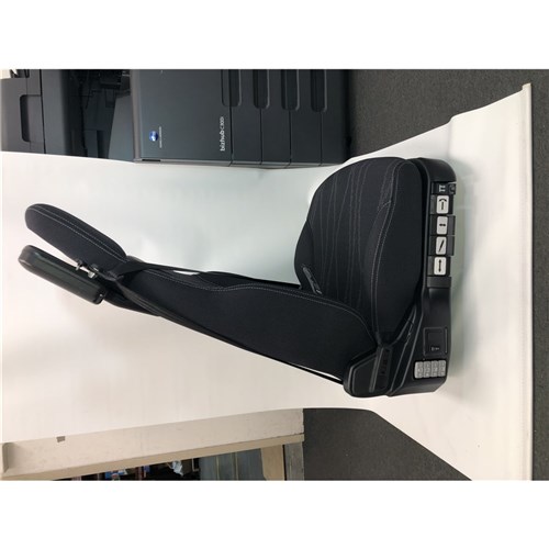 Features include air operated adjustments of seat angle, slide rails, dual lumbar supports, side bolsters and optional shoulder support. Dual locking manual backrest recline, adjustable damper and seat cushion length, air dump valve, independent height and weight adjustment, integrated seat belt with adjustable shoulder height and 180kg operator weight rating.